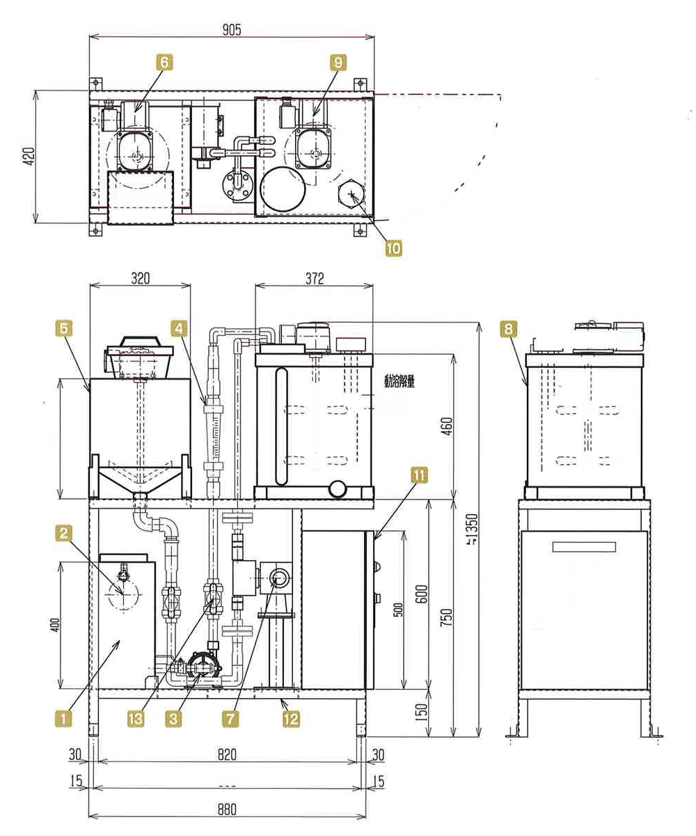 No 名称 機器仕様 数量 備考 1 希釈水槽 SUS304-400×200×400H-30L 1 2 ボールタップ 複式ボールタップ13mm 1 3 希釈水供給ポンプ PMD-643B2P 1 65w/100w 4 流動計 max50L 1 5 液体高分子原液槽 SUS304-3200×280H-25L 1 6 液体高分子原液攪拌機 FSM-20-60-T50A 30rpm/60Hz 1 50w 7 液体高分子原液供給ポンプ CM-10Y-AV46-F15-T021 1 0.1kw 8 高分子溶解槽 PVC-3720×460H-50L 1 9 高分子溶解攪拌機 FSM-20-10-T50A 180rpm/60Hz 1 50w 10 高分子溶解量レベルセンサー 61F 1 11 操作盤 屋外設置タイプ 動力200V、操作回路200V 1 12 架台 SUS304 アングル溶接構造 1 13 流量調整バルブ ボールバルブ 1 14 高分子溶解液移送ポンプ オプション 1 総使用動力 50Hz 0.265kw 60Hz 0.3kw
